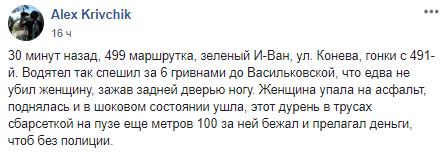 "30 минут назад, 499 маршрутка, зеленый И-Ван, ул. Конева, гонки с 491-й. Водятел так спешил за 6 гривнами до Васильковской, что едва не убил женщину, зажав задней дверью ногу. Женщина упала на асфальт, поднялась и в шоковом состоянии ушла, этот дурень в трусах сбарсеткой на пузе еще метров 100 за ней бежал и прелагал деньги, чтоб без полиции", - написал в соцсети очевидец.