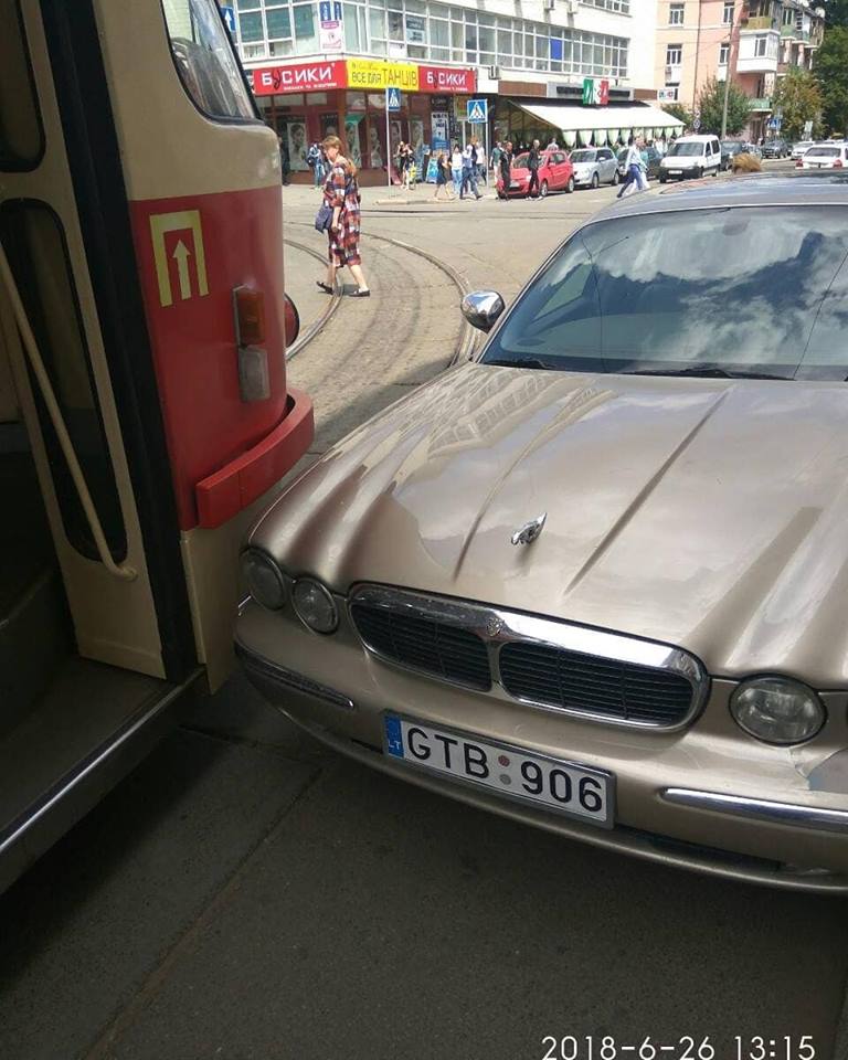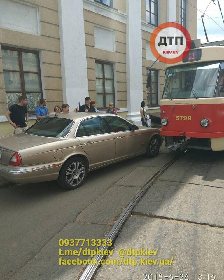 В центре Киева Jaguar на "евробляхах" заблокировал движение четырех маршрутов трамваев. Фото
