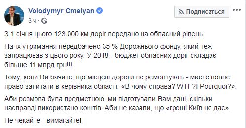 "Когда вы видите, что местные дороги не ремонтируются, вы имеете полное право спросить у руководителя области: "В чем дело? WTF?! Pourquoi? Чтобы разговор был предметным, мы подготовили вам данные, сколько на самом деле потрачено денег, чтобы не говорили, что деньги Киев не дает", - заключил Омелян.