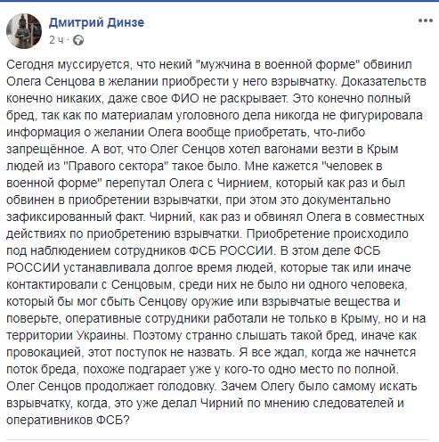 Адвокат пишет, что ему "странно слышать такой бред, иначе как провокацией, этот поступок не назвать". "Зачем Олегу было самому искать взрывчатку, когда, это уже делал Чирний по мнению следователей и оперативников ФСБ?", - резюмировал он.
