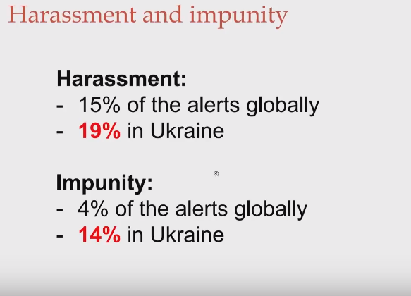 14% нарушений по Украине - это безнаказанность в отношении журналистов. Средний показатель по другим странам Европы составляет всего 4% - Украина таким образом "лидирует" с огромным отрывом.