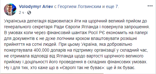 "В условиях, когда из-за финансового шантажа России СЕ экономит на бумаге для документов, не очень логично устраивать роскошные приемы на сотни людей. При этом Украина, которая добровольно пожертвовала 400 тысяч долларов на поддержку организации в сложное время, не получила ответа от Ягланда о стоимости ежегодного большого приема и целесообразности его проведения в сложных финансовых условиях", - заявил он.