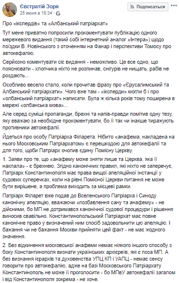 "Без отвержение московской анафемы нет никакого другого способа со стороны Константинополя признать украинских архиереев, которые вне МП (Московский патриархат, - Прим.Ред.). А без признания иерархов и духовенства УПЦ (КП) и УАПЦ - нет смысла говорить об автокефалии, ведь на базе Московского Патриархата Константинополь не может ее провозгласить - поскольку МП в Украине автокефалии в целом, и от Константинополя, в частности - не хочет", - написал представитель УПЦ КП.