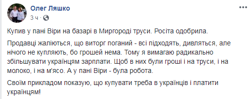 "Купил у женщины Веры на рынке в Миргороде трусы. Росита (жена - ред.) одобрила", - написал главный "радикал", посетовав, что украинцы бедные, и у торговцев мало выручки.