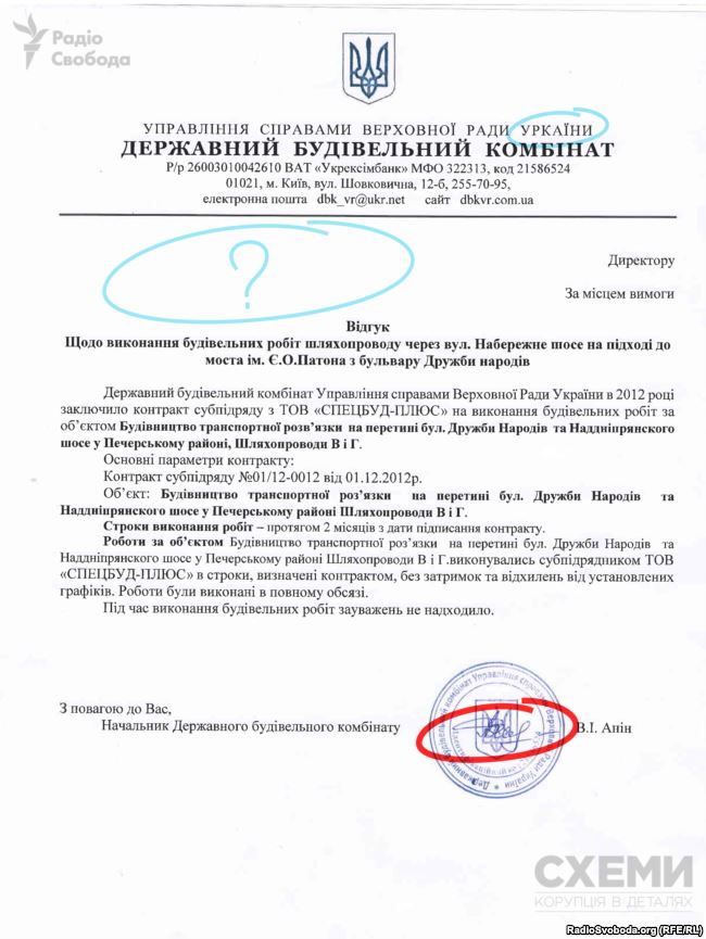 В строительном комбинате Верховной Рады, который якобы предоставил отзыв фирме "Спецстрой-Плюс", заявили "Схемам, что ничего не знают об этом документе.
