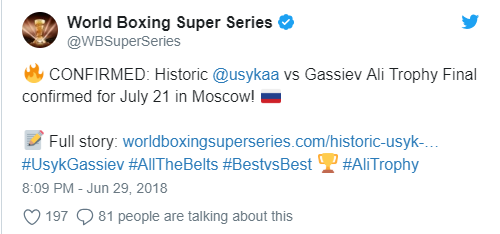 Руководство Всемирной боксёрской суперсерии (WBSS) официально подтвердило информацию о том, что финал турнира между украинцем Александром Усиком и россиянином Муратом Гассиевым пройдет в Москве на "Олимпийском" 21 июля.