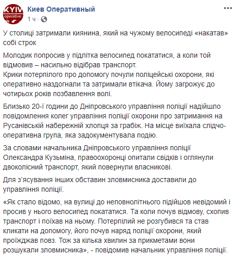 По словам начальника Днепровского управления полиции Александра Кузьмина, полицейские опросили свидетелей и осмотрели велосипед, вернули владельцу.