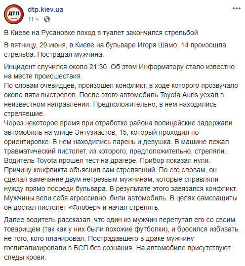 Вечером, 29 июня, в Киеве в районе Русановки произошла стрельба. Об этом передает "Киев оперативный".