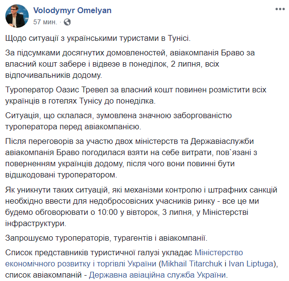 По словам Омеляна, в понедельник, 2 июля, будет обеспечено еще 5 рейсов, которые авиакомпания тоже выполняет за свой счет, чтобы все украинцы вернулись домой.