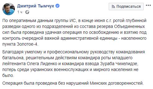 "По оперативным данным группы ИС, в конце июня с.г. ротой глубинной разведки одного из подразделений из состава резерва Объединенных сил была проведена удачная операция по освобождению и взятию под контроль очередной важной административной единицы - населенного пункта Золотое-4", - сообщил Тымчук.