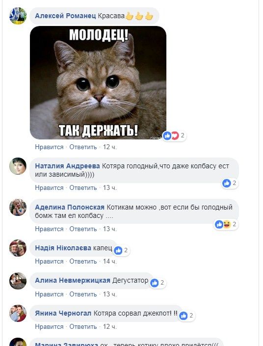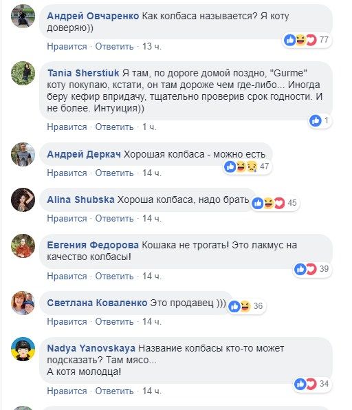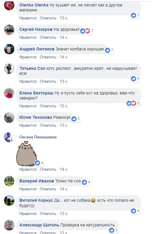 Любопытно, что большинстов пользователей соцсетей вовсе не возмущены действиями попавшего на видео кота. Люди усмотрели позитив в том, что кот "не побрезговал" магазинной колбасой, а значит она таким образом прошла тест на качество.