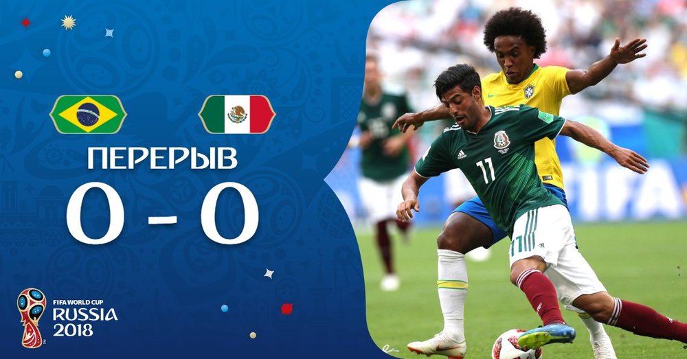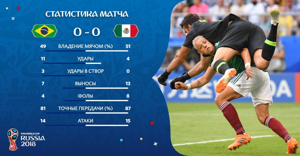 17.18 Если посчитать время владения мячом и удары в створ, то Бразилия доминирует, а вот если посмотреть на опасные моменты, то Мексика уже третий раз опасно прорывается в штрафную номинальных хозяев, но до точного удара дело не доходит по разным причинам.