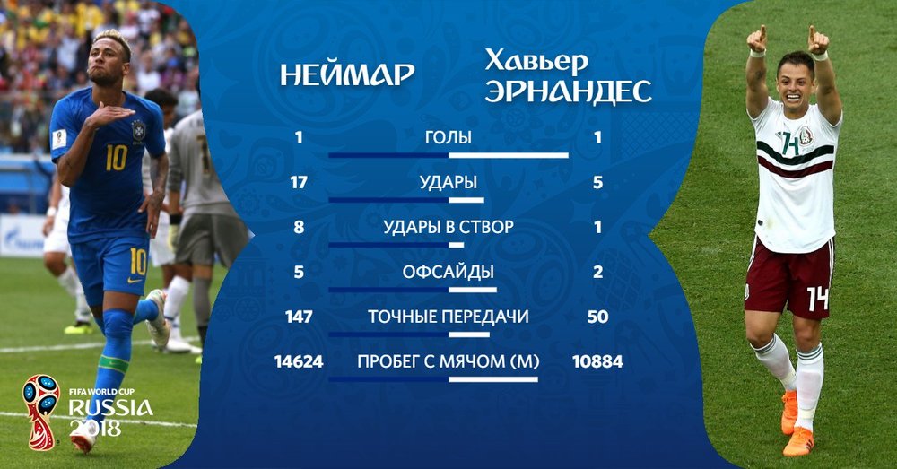 17.00 Посмотрим на статистику лидеров команд Неймара и Хавьера Эрнандеса. Играют не только они на поле, но они многое определяют.