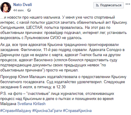 Прокурор Юлия Малашич подчеркнула, что в прошлый раз один из адвокатов Игорь Василенко пообещал предоставить суду документы о причинах его отсутствия на прошлых заседаниях, но в этот раз снова не пришел на заседание. Она попросила предоставить Крысину госадвоката. Суд удовлетворил ходатайство.