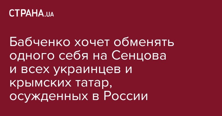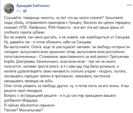"Вы не знаете, как меня достать, и не знаете, как освободиться от Сенцова. Ну, давайте так - я готов обменять себя на Сенцова… Олег готов умереть за свободу других, ну, я готов сесть за его жизнь. А вы решите свой геморрой. Вопрос с экстрадицией решите - я ж до сих пор гражданин вашего долбаного Мордора. Я сейчас абсолютно серьезно. Песков? Москалькова?", - написал Бабченко в своей странице в соцсети Facebook во вторник днем.