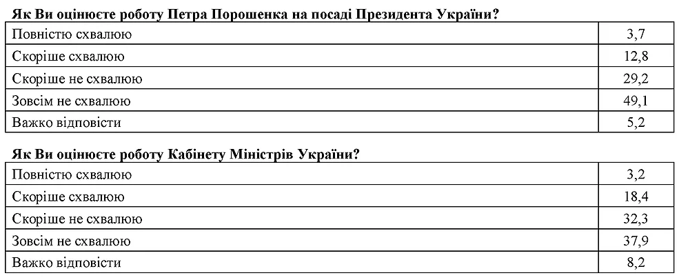 Центр социальных исследований "София" провел опрос о работе президента Петра Порошенко и Кабмина. Выяснилось, что 78,3% опрошенных центром не одобряют работу президента, а 70,2% - Кабинета Министров.