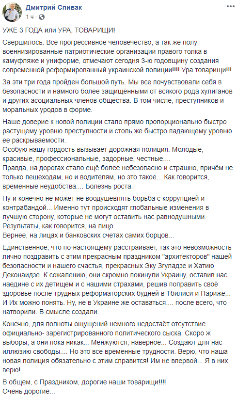 "Свершилось. Все прогрессивное человечество, а также полувоенизированные патриотические организации правого толка в камуфляже и униформе отмечают сегодня третью годовщину создания современной реформированной украинской полиции!!!! Ура, товарищи!!!