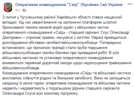 Несчастный случай произошел 3 июля в Чугуевском районе Харьковщины во время загрузки на железнодорожные платформы бронетехники. При выполнении этих работ был смертельно травмирован старший сержант Александр Скус.