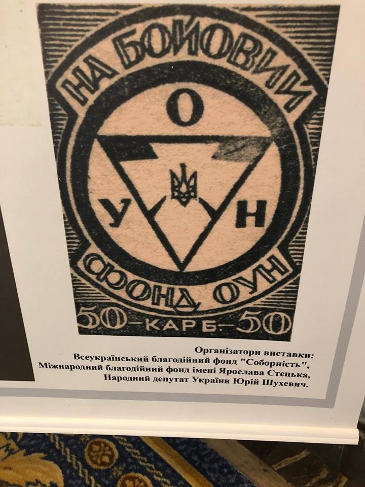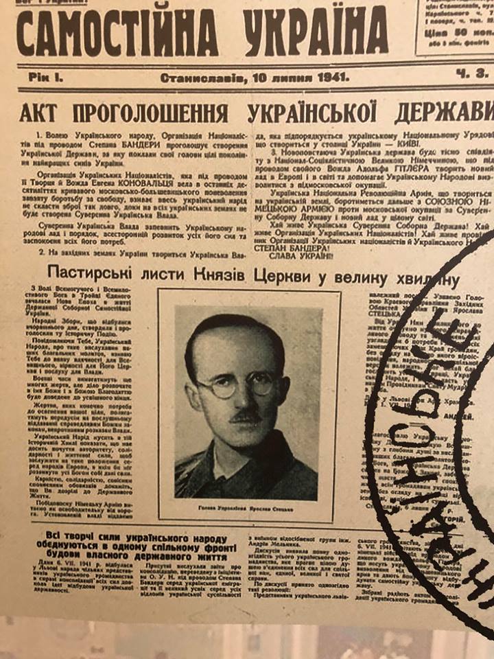 Экспозиция называется "Восстановление украинской государственности во время Второй Мировой войны" и посвящена 77-летию провозглашения Акта восстановления украинского государства 30 июня 1941 года. Его объявили сторонники бандеровского крыла в ОУН. Будущее украинское государство ими виделось как союзник нацистской Германии. О чем, собственно, прямо написано в самом Акте:
