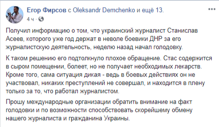 "К таком решению его подтолкнуло плохое обращение. Стас содержится в сыром помещении, болеет, но не получает необходимых лекарств. Кроме того, сама ситуация дикая - ведь в боевых действиях он не участвовал, никаких преступлений не совершал, и находится в плену только за то, что работал журналистом," - написал Фирсов.