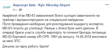 "После проведения необходимых для расследования инцидента экспертиз, MD-83 (1991 года выпуска) готовят к утилизации. Ранее с самолета были сняты двигатели. В операции принимали участие службы аэропорта и пожарные бригады аэропорта", - отметили в сообщении.