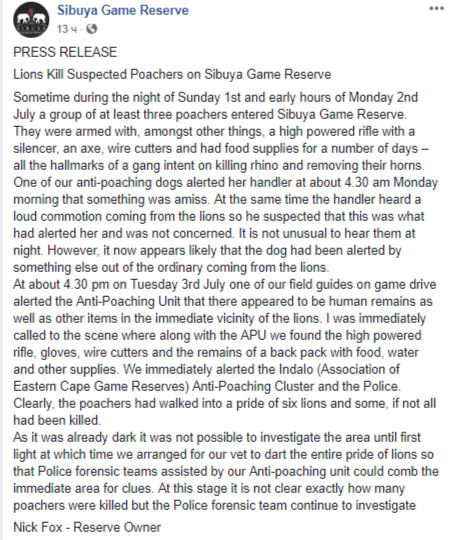 Прочесать территорию им удалось только в светлое время суток 4 июля, когда ветеринар заповедника обездвижил всех членов прайда дротиками со снотворным. "Пока неясно, сколько браконьеров было убито. Судмедэксперты продолжают работу", - написал  Фокс.