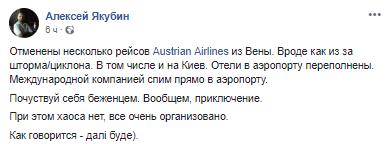 "Отменены несколько рейсов Austrian Airlines из Вены. Вроде как из за шторма/циклона. В том числе и на Киев. Отели в аэропорту переполнены. Международной компанией спим прямо в аэропорту.