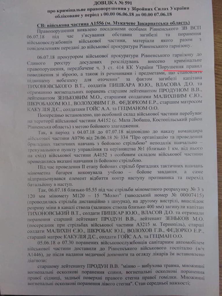 Ровенская военная прокуратура уже открыла дело по статье "Нарушение правил обращения с оружием", говорится в документе.