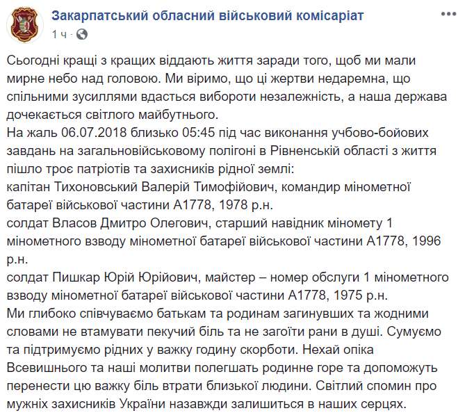 В результате ЧП двое бойцов погибли на месте, еще двое по дороге в больницу. Двое из погибших - жители Ужгорода, один – Перечина. Еще четыре человека получили ранения. Изначально сообщалось о трех погибших.