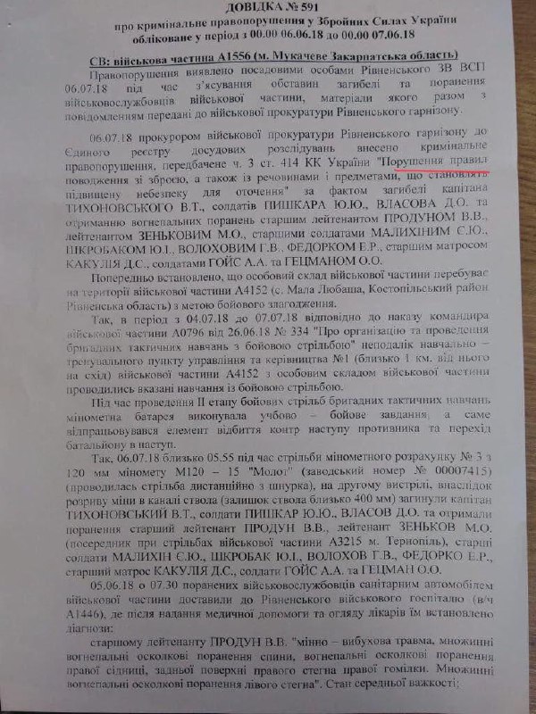 В справке №591 сообщается, что прокурором военной прокуратуры Ровенского гарнизона в ЕРДСУ внесено криминальное правонарушение по ч. 3 ст. 414 "Нарушение правил обращения с оружием..."