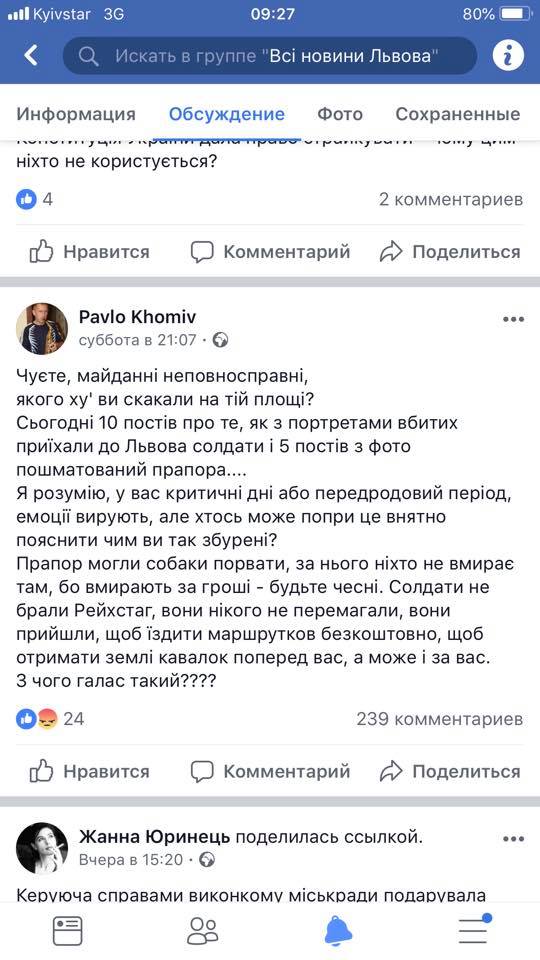 Еще один пост, возмутивший АТОшников Фото: Pavlo Khomiv/Facebook
