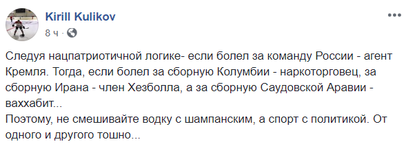 "Следуя нацпатриотичной логике, если болел за команду России - агент Кремля. Тогда, если болел за сборную Колумбии - наркоторговец, за сборную Ирана - член Хезболла, а за сборную Саудовской Аравии - ваххабит", - замечает экс-глава украинского бюро Интерпола Кирилл Куликов.