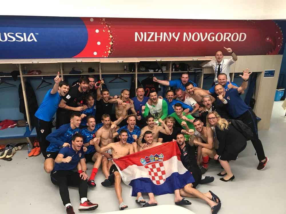 Игрок сборной Хорватии Марко Пьяца опубликовал в своем Twitter совместное фото с президентом из раздевалки сборной. Глава государства вместе с футболистами скандировала победные речевки.
