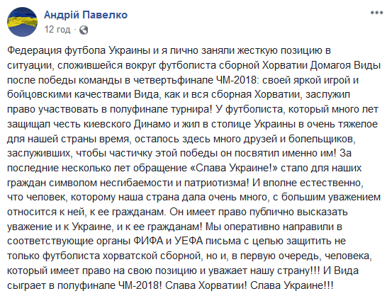"У футболиста, который много лет защищал честь киевского Динамо и жил в столице Украины в очень тяжелое для нашей страны время, осталось здесь много друзей и болельщиков, заслуживших, чтобы частичку этой победы он посвятил именно им! За последние несколько лет обращение "Слава Украине!" стало для наших граждан символом несгибаемости и патриотизма! И вполне естественно, что человек, которому наша страна дала очень много, с большим уважением относится к ней, к ее гражданам. Он имеет право публично высказать уважение и к Украине, и к ее гражданам! Мы оперативно направили в соответствующие органы ФИФА и УЕФА письма с целью защитить не только футболиста хорватской сборной, но и, в первую очередь, человека, который имеет право на свою позицию и уважает нашу страну!!! И Вида сыграет в полуфинале ЧМ-2018! Слава Хорватии! Слава Украине!!!", - написал Павелко.
