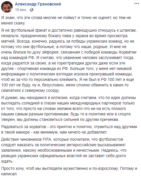 Действия чиновников FIFA, которые посчитали, что футболистов следует наказать за политические антироссийские высказывания/заявления, нахожу необоснованными и нечестными. Надеюсь, что реакция украинских официальных властей не заставит себя долго ждать".