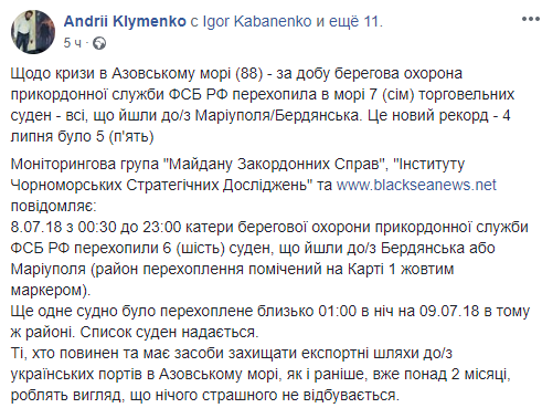 "8 июля с 00:30 до 23:00 катера береговой охраны пограничной службы ФСБ РФ перехватили шесть судов, направлявшихся в/из Бердянска или Мариуполя. Еще одно судно было перехвачено около 01:00 в ночь на 9 июля в том же районе", - написал Клименко.