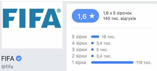 Участники флешмоба ставят страничке Международной федерации футбола в Facebook ставят самую низкую оценку - "1" вместо максимальной "5" и пишут в комментариях "Слава Украине!"