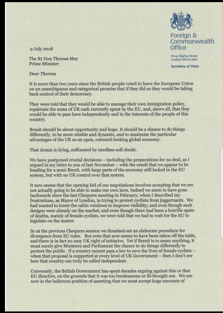 В своем заявлении, в частности, он пишет о том, что в результате действий британских властей на переговорах по выходу Великобритании из состава ЕС, были потеряны возможности, на которые надеялся народ страны. По словам Джонсона, "мечта умирает" из-за того, что Британии придется смириться с нормами европейского права, которые ей навязываются извне, не имея возможности повлиять на них.