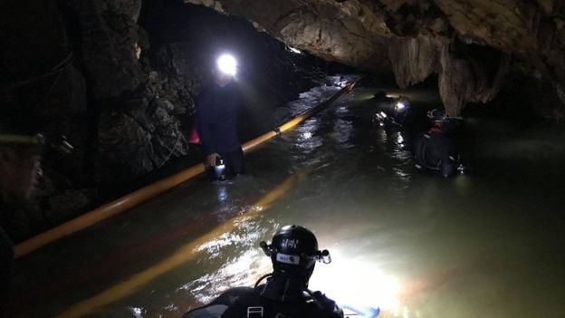 Параллельно тайцы откачивают воду рукавами диаметром в 15-30 сантиметров. Сначала откачивали по 5 кубов в минуту, сейчас 40 кубов в минуту. Понимая, что этого недостаточно, спасатели попытались отвести воду из расположенного рядом водопада, чтобы она не попадала в пещеру. Они начали осушать источники и озера внизу, немного ниже этой пещеры, для того, чтобы воде из пещеры было куда идти. У пещеры сейчас огромное количество техники, которая постоянно работает.