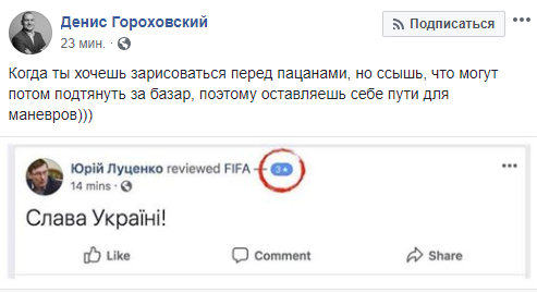 Луценко, к слову, повел себя хитро и поставил странице ФИФА нейтральную "троечку". Но тоже написал "Слава Украине!".