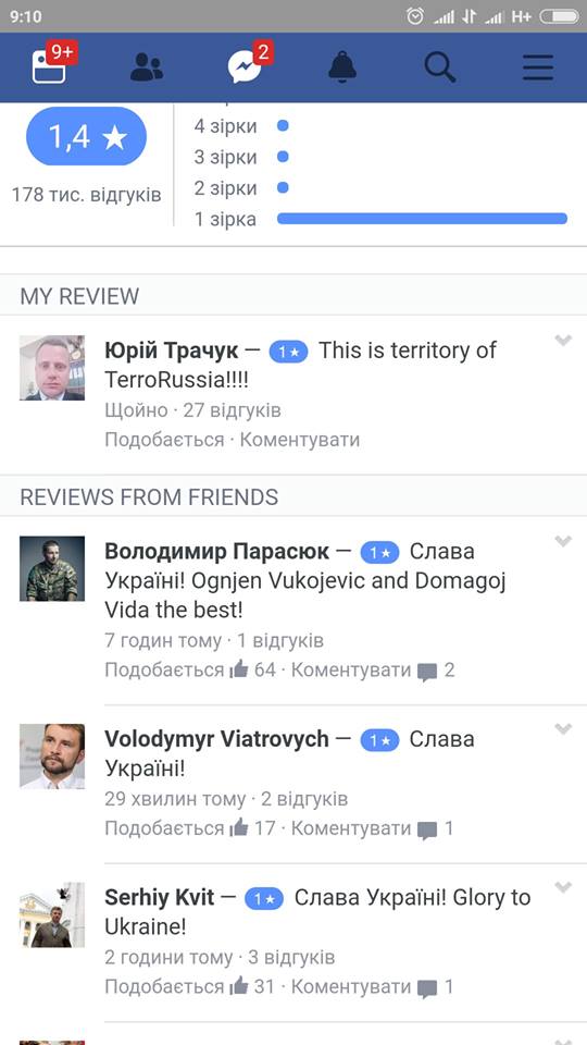 В длинной ленте негативных отзывов от украинцев встречаются россияне, которые иногда ставят странице пять баллов и пытаются спорить с участниками флешмоба: