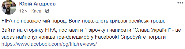Зайти на страницу FIFA, поставить 1 звездочку и написать "Слава Украине!" - это сейчас самая популярная игра-флешмоб в Facebook! Попробуйте поиграть", - предложил он.