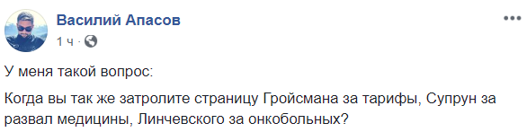 "У меня такой вопрос: когда вы так же затролите страницу Гройсмана за тарифы, Супрун за развал медицины, Линчевского за онкобольных?", - интересуется журналист Василий Апасов?
