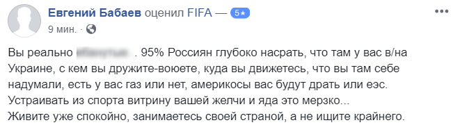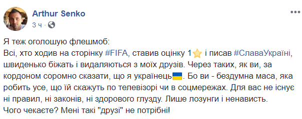 "Все, кто ходил на страницу #FIFA, ставил оценку 1 и писал # СлаваУкраине, быстро бегут и удаляются из моих друзей. Из-за таких, как вы, за рубежом стыдно сказать, что я украинец. Ибо вы - бездумная масса, которая делает все, что ей скажут по телевизору или в соцсетях. Для вас не существует ни правил, ни законов, ни здравого смысла. Только лозунги и ненависть.