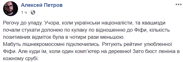 "Хохочу до упаду. Вчера, когда украинские националисты, и хвашизды начали стучать ладонью по кулаку по отношению к Фифа, количество положительных отметок было в четыре раза меньше.