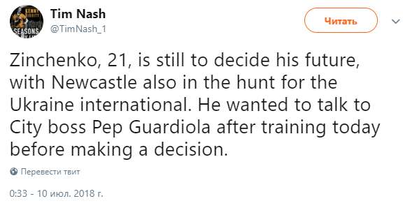 По его словам, "Ньюкасл" активно ведет переговоры с украинским футболистом. После одной из тренировок репортер даже побеседовал с главным тренером "Сити" Гвардиолой на тему планов клуба на Зинченко.