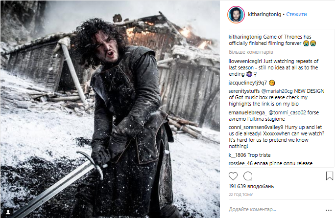 Напомним, что ранее о завершении съемок в сериале оригинально сообщила актриса Мейси Уильямс (Арья Старк), а также актриса Эмилия Кларк, исполняющая роль Дейенерис Таргариен.