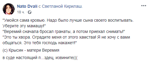 "Умойся сама кровью. Надо было лучше сына своего воспитывать. Уберите эту мамашу! Веремий сначала бросал гранаты, а затем приехал снимать! Это ты хвора. Защитите меня от этого хамства, я не хочу с вами общаться. Это тебя господь накажет!", - процитировала журналистка высказывания Крысина во время заседания суда.