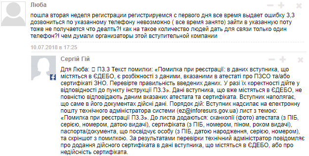 Не обходится без проблем при регистрации электронных кабинетов. На сайте Освiта.ua абитуриенты жалуются, что у кого-то не получается внести данные - постоянно появляется запрос о повторной регистрации, кого-то не нашли в Единой базе данных гражданина Украины или при попытке войти в кабинет появляется сообщение об ошибке. Также поступающие жалуются, что для связи указана почта ez@inforesurs.gov.ua (технический администратор системы) и единственный телефон (044) 290-18-13, дозвониться на который сложно. Некоторые делятся опытом, что приходится звонить по нескольку раз, чтобы дождаться связи с оператором.