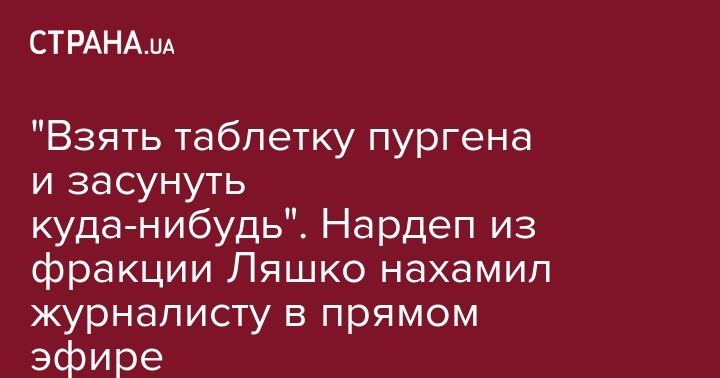 Народный депутат, член Радикальной партии, Олег Куприенко в прямом эфире на телеканале ZIK предложил главному редактору "РБК-Украина" Сергею Щербине "засунуть "пурген" куда-нибудь". Данные слова прозвучали, когда Куприенко комментировал инициативу об ограничении для журналистов доступа к кулуарам Рады.